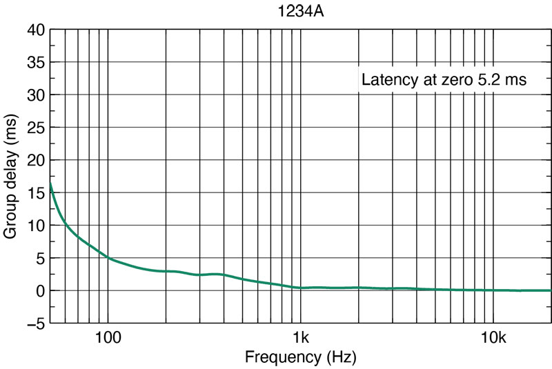 In Genelec performance graphics, the time of converting the from an electronic input signal to the acoustic output in a Genelec monitor is described by two factors – latency and group delay. The group delay factor can be read in the graphics for a specific frequency. The total frequency-specific input-to-output delay is a sum of the latency and group delay factors. To understand the significance of this total delay, consider that moving a loudspeaker away by 1 meter creates an additional delay of about 3 ms.