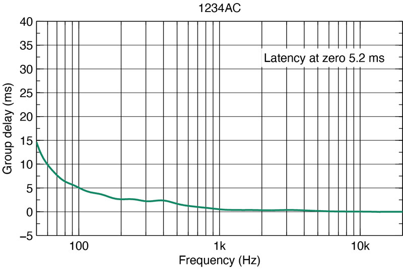 In Genelec performance graphics, the time of converting the from an electronic input signal to the acoustic output in a Genelec monitor is described by two factors – latency and group delay. The group delay factor can be read in the graphics for a specific frequency. The total frequency-specific input-to-output delay is a sum of the latency and group delay factors. To understand the significance of this total delay, consider that moving a loudspeaker away by 1 meter creates an additional delay of about 3 ms.