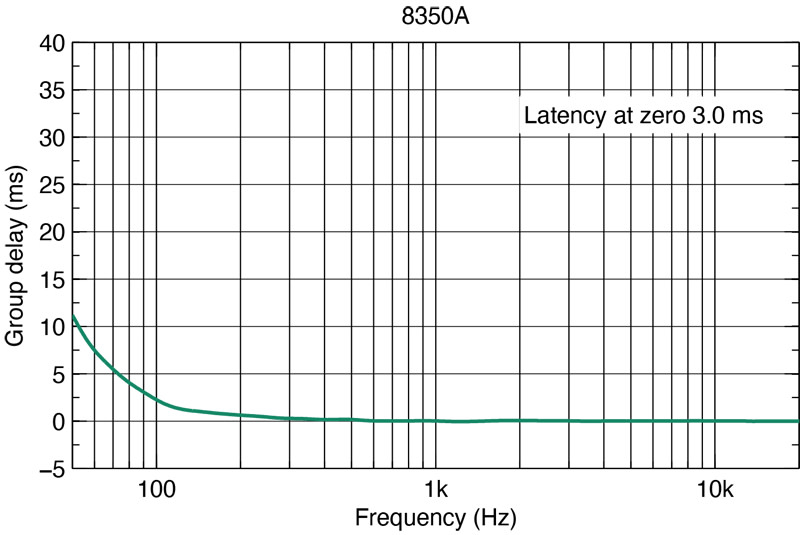 In Genelec performance graphics, the time of converting the from an electronic input signal to the acoustic output in a Genelec monitor is described by two factors – latency and group delay. The group delay factor can be read in the graphics for a specific frequency. The total frequency-specific input-to-output delay is a sum of the latency and group delay factors. To understand the significance of this total delay, consider that moving a loudspeaker away by 1 meter creates an additional delay of about 3 ms.