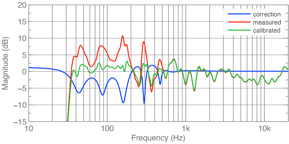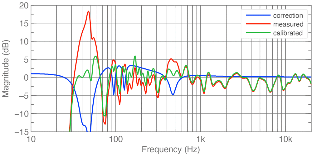 GLM users will be familiar with this graph. It's the same one that appears after calibration to show the measured frequency response of your system (red line), GLM's corrective filtering (blue line), and the resulting response after correction (green line). GLM aims to achieve a flat response, giving you the best possible foundation to work from.