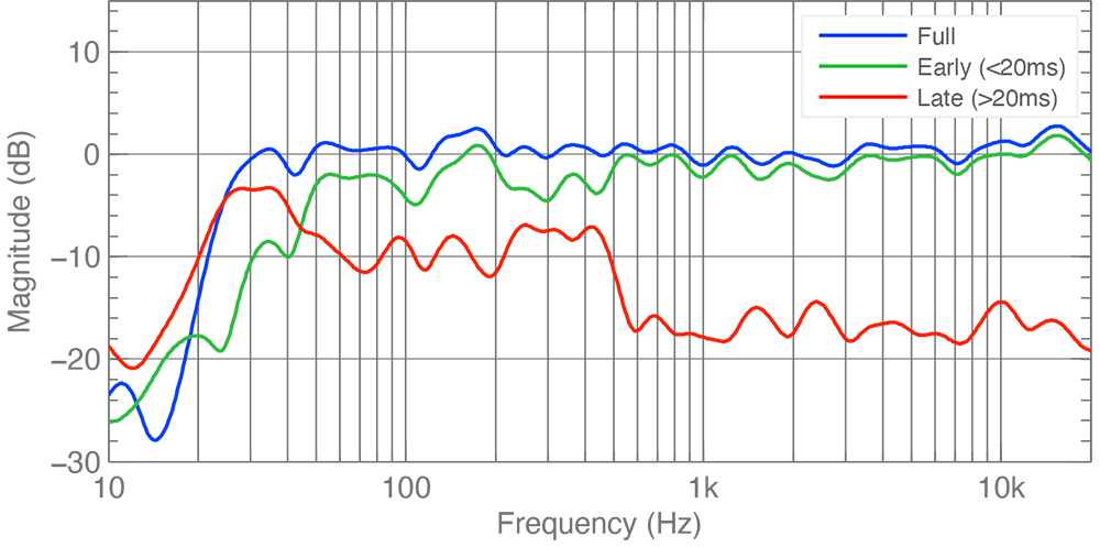 Whether you're mixing audio or simply listening to it, it's always best to hear the direct sound from your monitors rather than the room sound. GRADE compares every sound arriving at the listening position within 20 milliseconds to the late reflections that arrive afterwards. This allows you to determine whether you have enough direct sound at your listening position, and may help inform any further use of acoustic treatment.