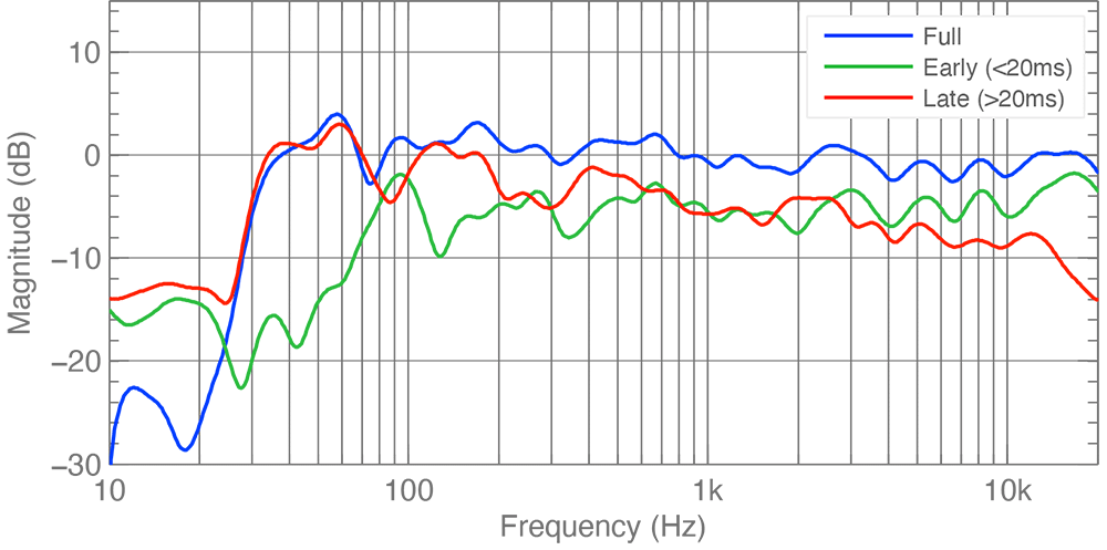 Early reflections are well controlled due to treatment. There are very few red, orange or yellow spikes, especially in the higher frequencies, the blue colour indicating low-level reflections.