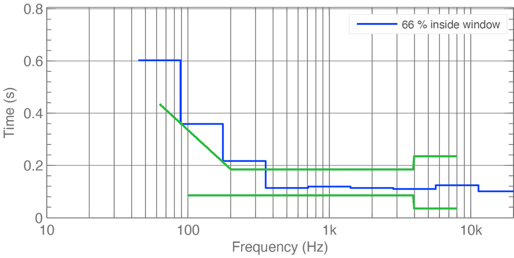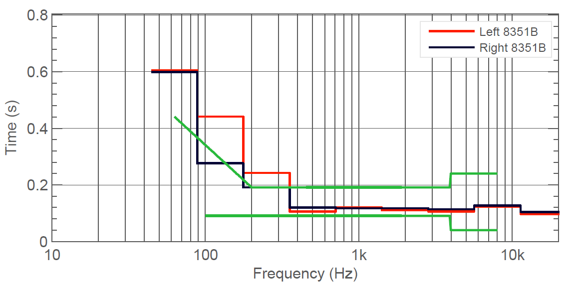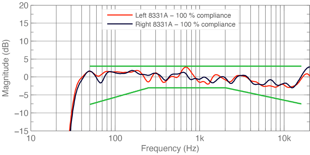 The frequency response at the listening position is called the operational room response. Ideally, GRADE will show a very similar level across all frequencies, indicating a neutral, uncoloured listening experience that complies with ITU-R recommendations. The green lines in the diagram show how far the results can safely deviate from a perfectly flat response without significant colouration or failure to comply with the recommendations.