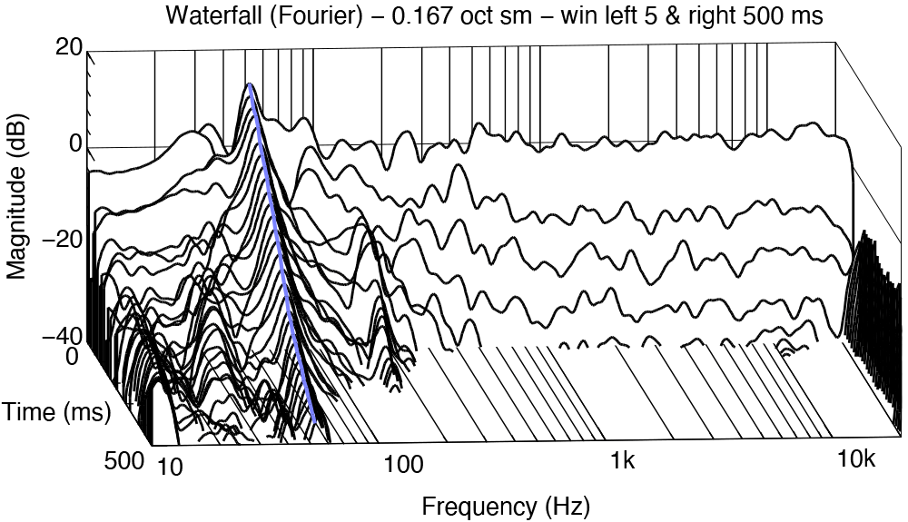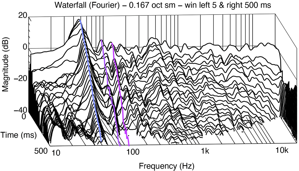 GRADE's Waterfall analysis allows you to spot issues in the decay time of different frequencies, which is helpful in evaluating the effects of acoustic treatment. The measurements reveal the presence of lengthy decays, known as ringing, which can negatively affect your listening and recording experience through masking and intrusive room sound. In general, low frequencies and room modes ring for longer than mid and high frequencies.