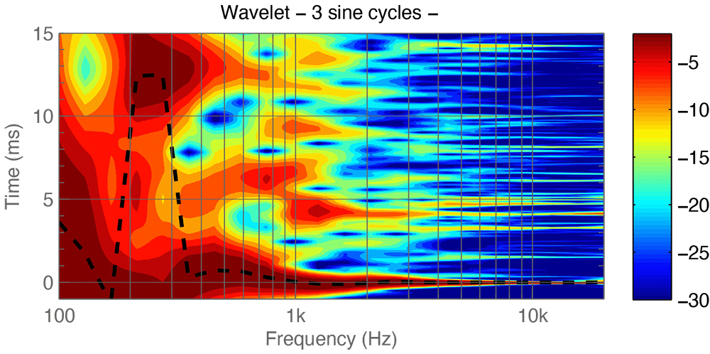 GRADE's Wavelet analysis shows time and frequency in much more detail than the Waterfall analysis. This extra resolution enables a greater understanding of the reflections in your room, complementing Waterfall's focus on resonance. The Wavelet diagram helps you to evaluate both your acoustic treatment and the positioning of your system.