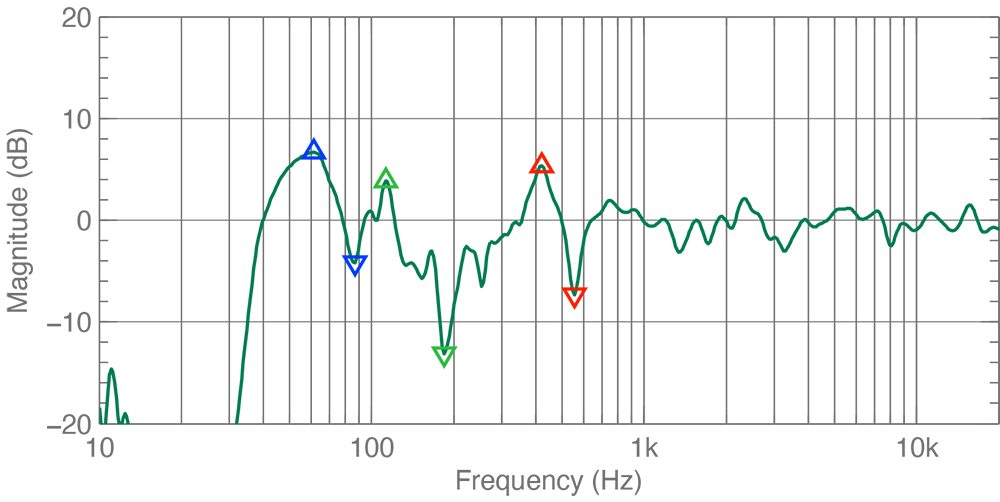 The marked notches are of particular interest. They may be caused by hard-surface reflections at a certain distance, leading to frequency cancellation. Placement should be optimised to avoid these negative effects.