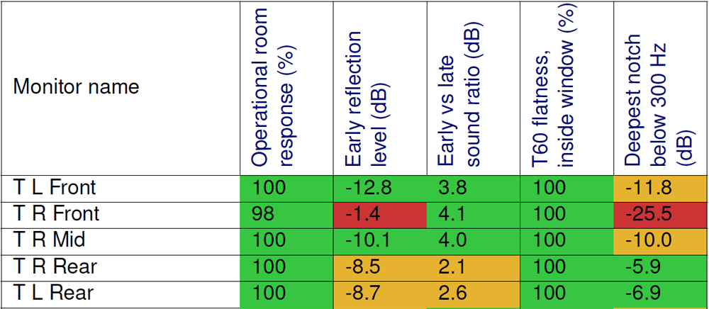 Using the early reflections measurements detailed in the Time Domain Analysis section detailed above, GRADE allows you to check if your room meets the ITU-R recommendation that early reflections are – 10 dB relative to the direct sound from the monitors.