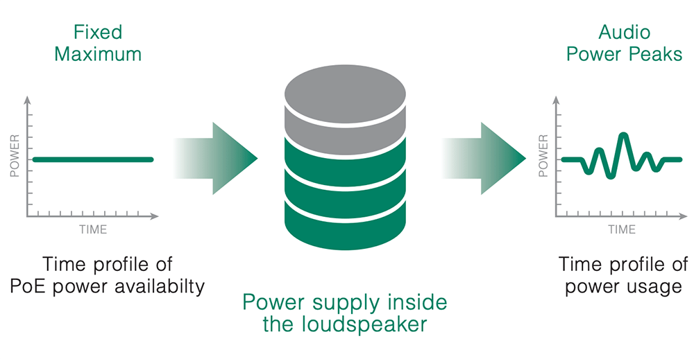 The internal power supply stores power, to enable Smart IP loudspeakers to work with real audio signals, music and speech. Since audio signals are dynamic, periods of high peak power typically have finite duration while the effective average power level, or RMS power, remains much lower.